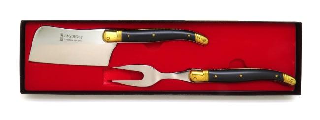 Ce service fromage laguiole est composé d'un couperet et d'une fourchette en inox, de deux mitres en laiton pliées et d'un manche noir en résine. La longueur des manches est de 12 cm. La longueur totale du couperet est de 20,5 cm, la largeur maximale de sa partie coupante est de 4 cm environ, la fourchette mesure 21 cm.