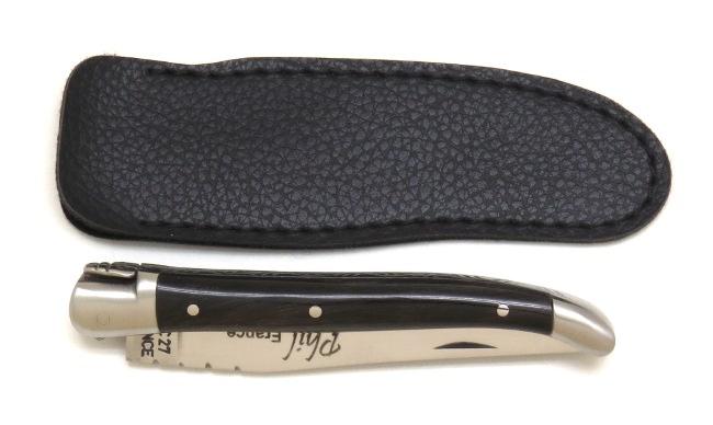 Avec ce petit couteau pliant Laguiole, un étui pour la poche en simili cuir noir est offert par notre coutellerie artisanale