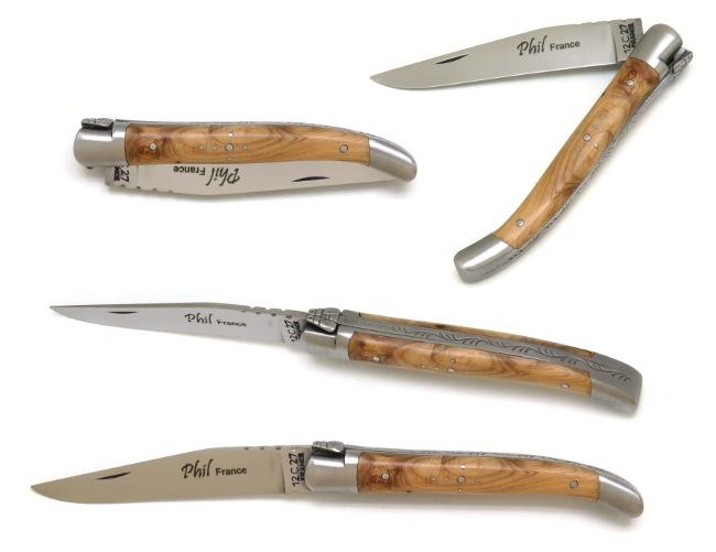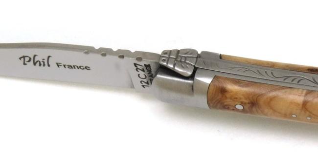 Descriptif - Couteau Laguiole PHIL manche en bois de genévrier - 2 mitres inox - manche 11 cm