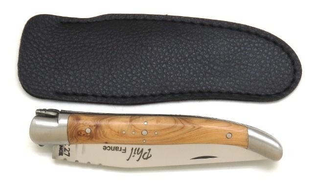 Taille idéale pour la poche, ce couteau pliant Laguiole trouvera aisément une place dans votre quotidien. De fabrication 100% française, ce couteau Laguiole fabriqué par PHIL vous séduira par la qualité de son assemblage et de ses finitions, sans négliger la qualité de sa coupe avec une lame en 12C27 réalisée dans les règles de l'art sur le bassin de coutellerie de Thiers en France. Vous trouverez original ce couteau Laguiole et son manche en bois de genévrier (cade) : un bois toujours singulier et à l'odeur agréable (on se sert du cade pour fabriquer de l'encens)
