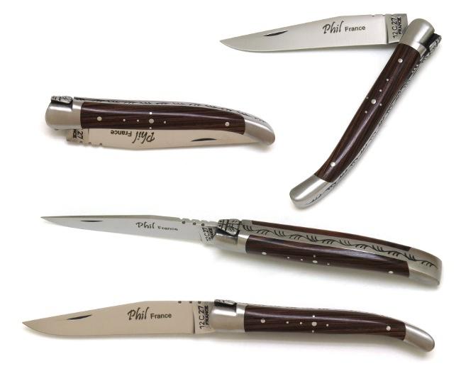 Parfum délicat pour ce couteau Laguiole artisanal en bois de cadeTaille idéale pour la poche, ce couteau pliant Laguiole trouvera aisément une place dans votre quotidien. De fabrication 100% française, ce couteau Laguiole fabriqué par PHIL vous séduira par la qualité de son assemblage et de ses finitions, sans négliger la qualité de sa coupe avec une lame en 12C27 réalisée dans les règles de l'art sur le bassin de coutellerie de Thiers en France. Vous trouverez original ce couteau Laguiole et son manche en bois de genévrier (cade) : un bois toujours singulier et à l'odeur agréable (on se sert du cade pour fabriquer de l'encens)Côté finition : les parties métalliques du couteau de poche sont brossées pour une finition mate et satinée. Le ressort est finement ciselé mécaniquement.Côté technique : la lame du couteau pliant en acier Sandvik 12C27 vous assurera tenue de coupe et facilité d'affûtage et sa lame à cran forcé vous fournira une bonne sécurité d'utilisation couteau ouvert.Côté dimensions : le couteau Laguiole mesure 20 cm ouvert pour un manche de 11 cmCôté fabrication : ce couteau pliant est fabriqué sur le bassin coutelier de Thiers en France.Côté entretien : le nettoyage de la lame du couteau Laguiole est à réaliser à l'eau claire, Après lavage, la lame devra être séchée en l'essuyant. Pour en faciliter le fonctionnement et en limiter l'usure, il convient de lubrifier, régulièrement, avec une huile fine appropriée le mécanisme du couteau. Pour le manche en bois de genévrier, éviter tout contact avec eau et liquide. Si le bois est mouillé, il convient de le sécher le plus rapidement possible. Le décrassage du bois de cade est à réaliser avec de l'essence de térébenthine pour être nourri ensuite à l'huile de linAvec ce couteau pliant, un étui pour la poche en simili cuir noir est offert par notre coutellerie artisanale Côté options : vous trouverez ci-dessous les différents étuis port ceinture que nous proposons pour ce couteau Laguiole artisanal en bois, ainsi que les options de gravure pour commander un couteau personnalisé avec un prénom, une date, des initiales, ...PHIL, COUTELIER A THIERS : COUTEAU LAGUIOLE ARTISANAL EN BOIS ET EN CORNE