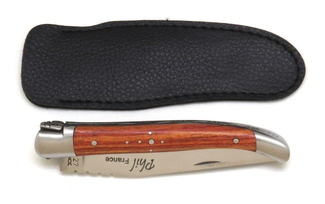 Avec ce couteau fermant Laguiole en bois, un étui pour la poche en simili cuir noir est offert par notre coutellerie artisanale