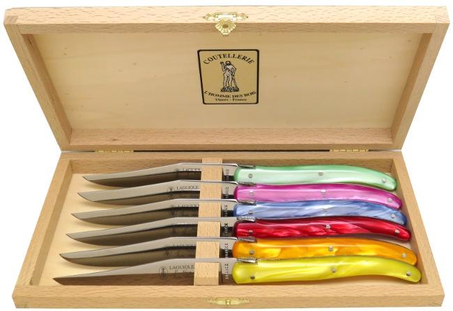 Descriptif - 6 Couteaux de table Laguiole plein manche en coffret bois - manche en résine nacrée 6 couleurs acidulées