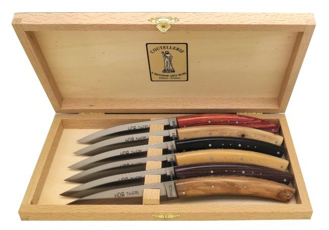 Descriptif - Coffret de 6 couteaux de table L'HOMME DES BOIS - plein manche en 6 bois : Olivier, ébène, bois de rose, buis, bois de violette et genévrier.
